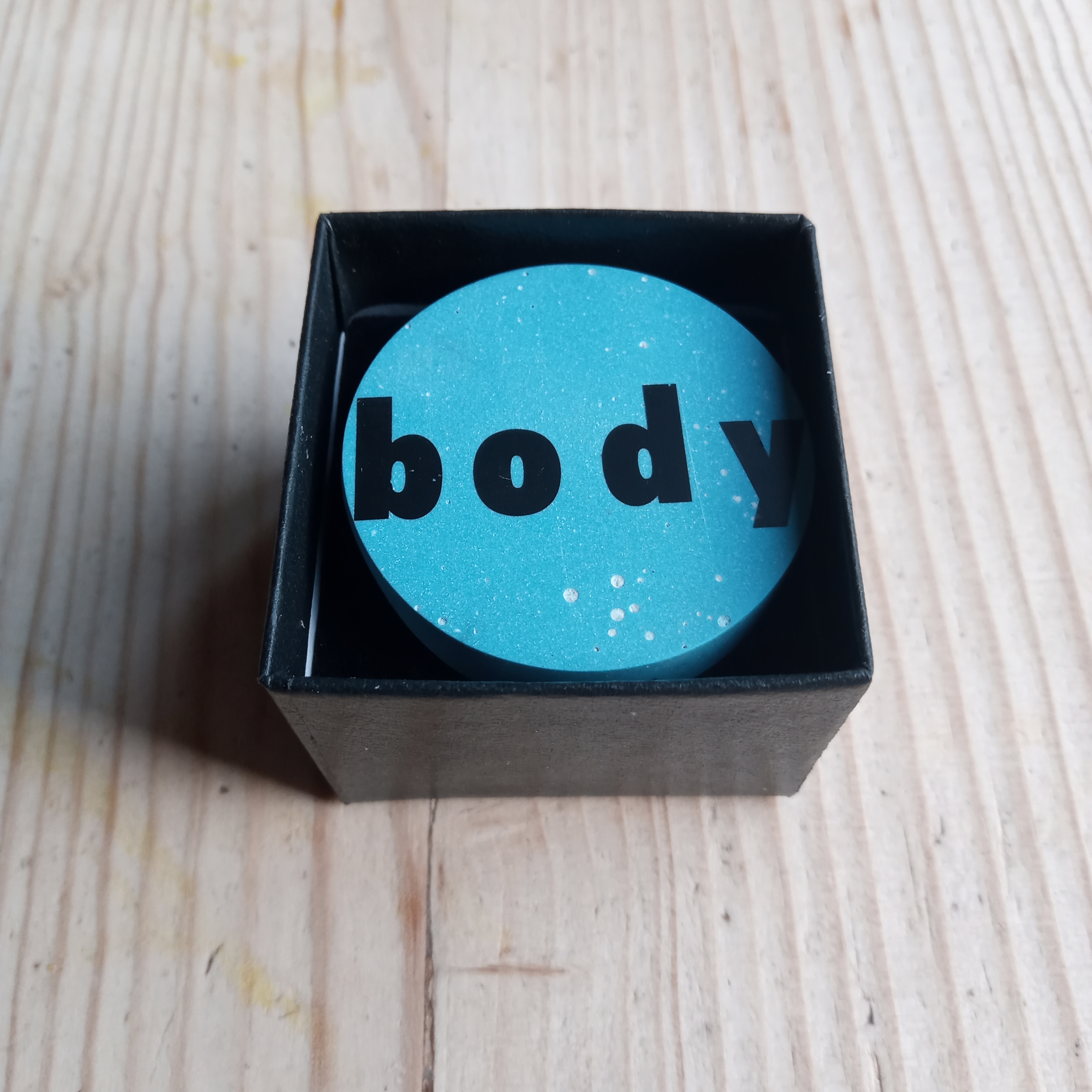 White-flecked blue jesmonite wafer with Letraset in black jewellery box. Run of 20.